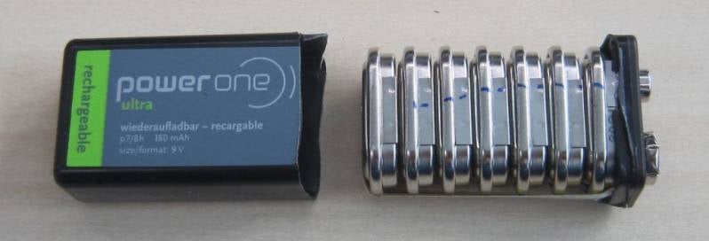 Iedereen kent ze wel, de 9V blokbatterij. Ze zijn er in Alkaline kool-zink en Ni-Cd uitvoering. De laatste is oplaadbaar. Het zijn altijd samenstellingen van meerdere cellen van 6x 1,5V of bij Ni-Cd 7x 1,2V. Van binnen zien ze er zo uit: