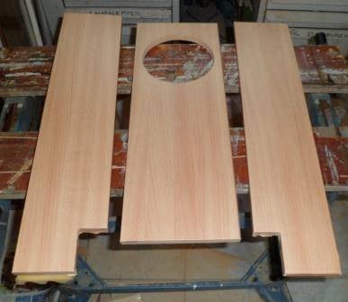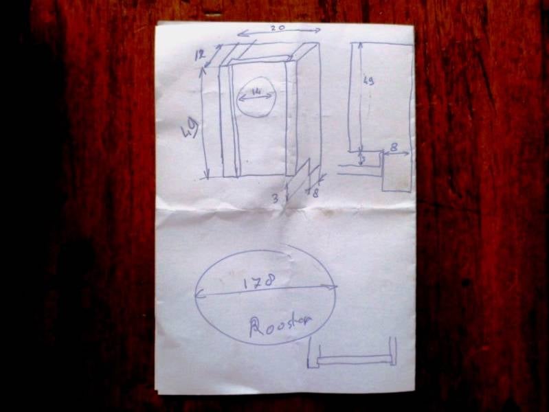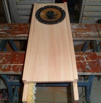 Voor de boxen had ik een open systeem in gedachte, autoluidsprekers zijn daarvoor ontworpen. De boxen zonder achterwand tegen de muur naast de monitor en met de open onderkant langs het tafelblad naar beneden. Een schets gemaakt en aan de slag.