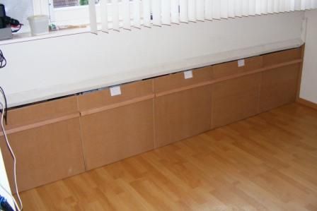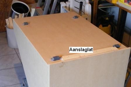 In ons nieuwe onderkomen kreeg ik de zolder ter beschikking als (elektronica)hobbyruimte. Dan zit je altijd met de lastige situatie dat je je spullen onder een schuine kant op moet bergen. Wat achteraan staat blijft dan meestal tot de volgende verhuizing staan. Er zijn (waren?) wel bakken te koop om onder het schuine dak spullen op te kunnen slaan, maar die zijn vooraan erg diep en wat dan onderaan terecht komt zie je ook nooit meer. Daarom had ik bedacht dat het handiger was een zijkant open te laten en met dozen te werken. Onder de bakken gedeeltelijk verzonken wieltjes om niet teveel ruimte te verliezen, en een aanslaglat op de bak en vloer om niet iedere keer tegen het dak aan te bonken als de bak weer terug geschoven wordt.