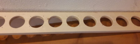 Al heel snel was ik erachter dat het lastig is om het gezaagde hout uit de gatenzaag te peuteren. Daarom eerst de gaten aan een kant van de plank met de kolomboormachine gedeeltelijk geboord, een paar mm laten staan. Daarna vanaf de andere kant de rest met een handboormachine. Er steekt voldoende hout onder de gatenzaag uit om het makkelijk te kunnen verwijderen.
