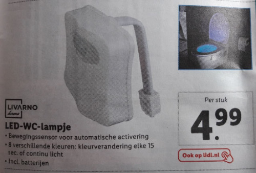 Ledverlichting voor in de WC pot. Wie verzint zoiets? De schaarste aan chips en dergelijke is kennelijk helemaal voorbij.