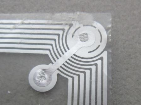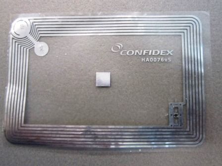 Het uiteindelijke binnenwerk. Een zilverkleurige spoel op een kunststof folie met, rechtsonder, de chip. Linksboven een brug om beide einden van de spoel met de chip te kunnen verbinden. Het geheel is niet dikker dan een stuk papier.