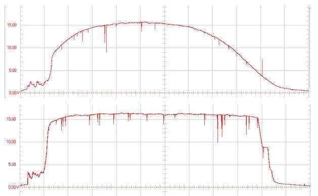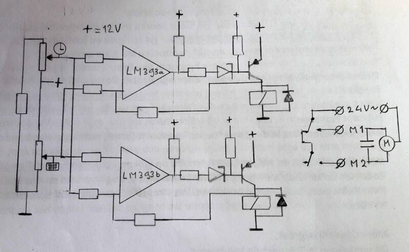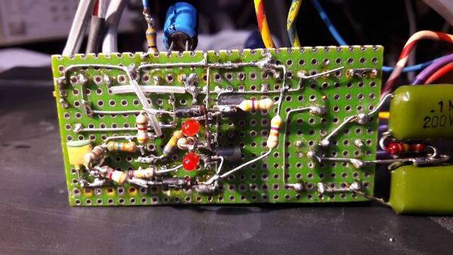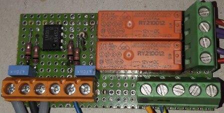 De nieuwe stuurprint. Geen opamps maar een dubbele comparator, LM393, wat de schakeling een stukje simpeler maakt. Toch was het nog zoeken naar een betrouwbare instelling. Er bleken nog extra weerstanden nodig om een grotere hysteresis te krijgen, en uiteindelijk nog 2 zenerdiodes en transistors toegevoegd om de schakeldrempel beter te definiëren. Of dat echt de simpelste oplossing is, weet ik niet. Met deze toevoeging kreeg ik de schakeling voldoende goed werkend en daar heb ik het bij gelaten.