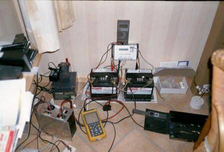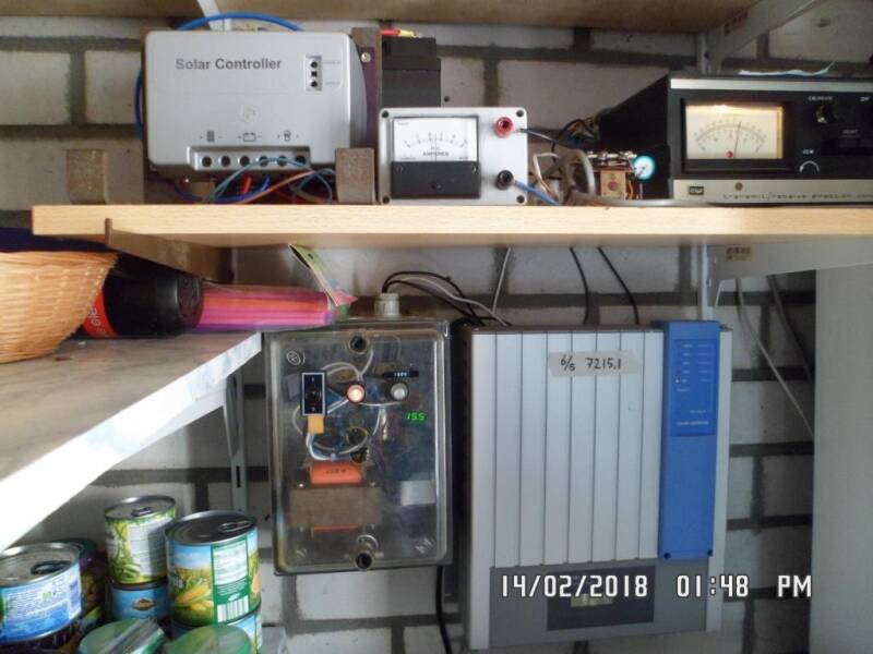 De eerste set-up. Laadregelaar, accu's en omvormer. En wat meetapparatuur. De voeding naar de huisinstallatie deed ik via een stopcontact, natuurlijk wel eerst de hoofdschakelaar in de meterkast uitgeschakeld! Het werkte wel, maar de koelkast had zoveel stroom nodig dat dit feest al na korte tijd voorbij was.