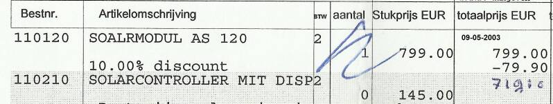 Het is 2003 als ik met de eerste experimenten begin. Bij Conrad een paneel gekocht (AS120) van 120Wp voor de lieve som van € 720,- (Jaren later zou je voor dat geld panelen met heel wat meer vermogen kunnen aanschaffen.) Daarbij hoort ook een laadregelaar voor de accu. De keus viel op een model van IVT.
