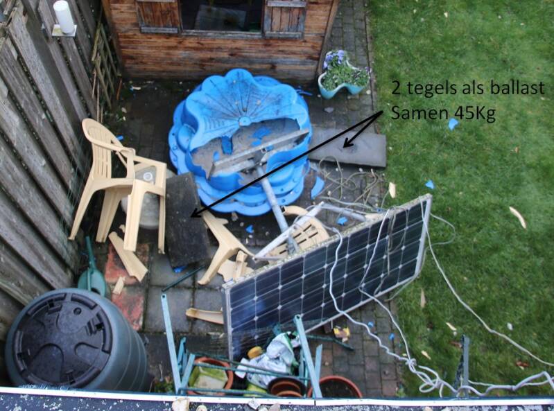 De nieuwe situatie: een berging met een plat dak en makkelijk bereikbaar. Het paneel staat al draaibaar opgesteld. De voet hiervoor is flink verzwaard met een stel dikke tegels. Dat is nodig gebleken...