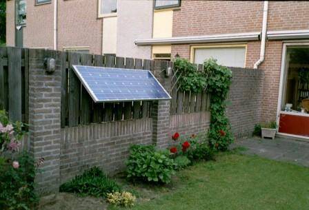 De eerste opstelplaats van het paneel. Het was de bedoeling om het paneel met een motor op een mast tegen de gevel te plaatsen om de zon te kunnen volgen. (Een ideaal wat bij die woning nooit verwezenlijkt is.)